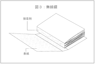 無線綴(図3参照)はそれに対し、ページ数の多い本に適しています。「無線」というのは、糸とか針金を使わず、背の部分を「接着剤」を用いて接着させる方式から、このように呼ばれています。ページ数の多いものは、「ノド」いっぱいには開きにくいので、ノドの部分の余白を狭くしすぎないように注意しなければいけません。