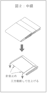 中綴(図2参照)は、よく週刊誌などで見かける製本方法で、背の部分を針金で綴じたものです。中綴については、あまり厚い製本のものには適さず、用紙の厚み、ページ数に制限があるということ、また週刊誌のように厚みのあるものは、表紙に近い外側のページと、内側のページとでは仕上り寸法を変えなくてはならないことなどに注意しなくてはいけません。